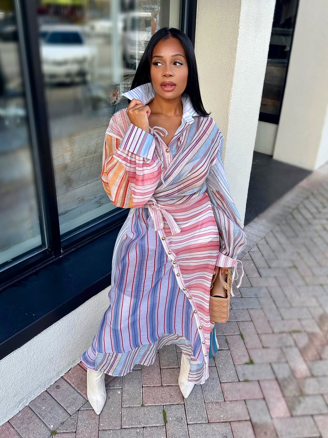 This vibrant pinstripe wrap dress brings color, movement and versatility to every look.