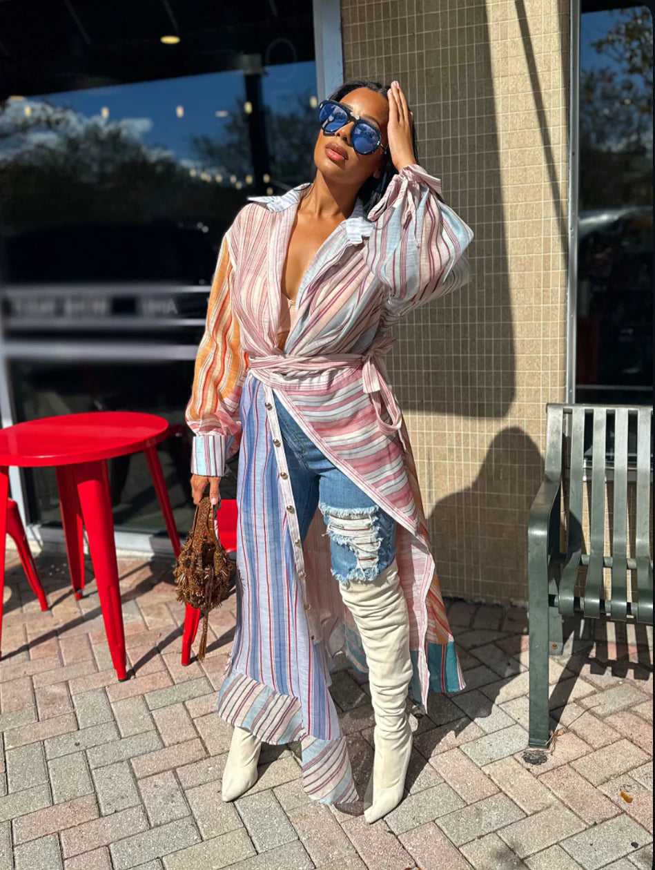 Featuring bold balloon sleeves, luxe gold buttons, and a flattering wrap silhouette, it’s designed to shine on its own or layer effortlessly as a duster.