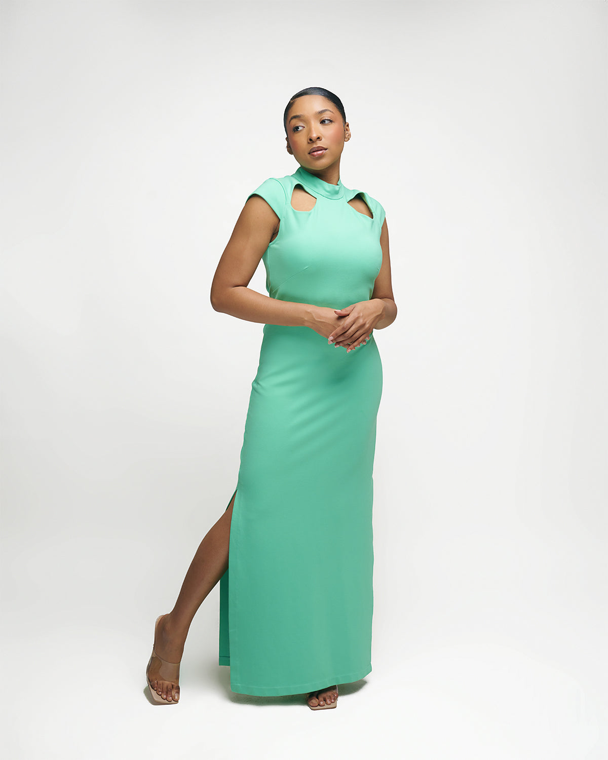 Sleek stretch ponte knit maxi dress with shoulder cutouts, side slit, and option for long or short sleeves.